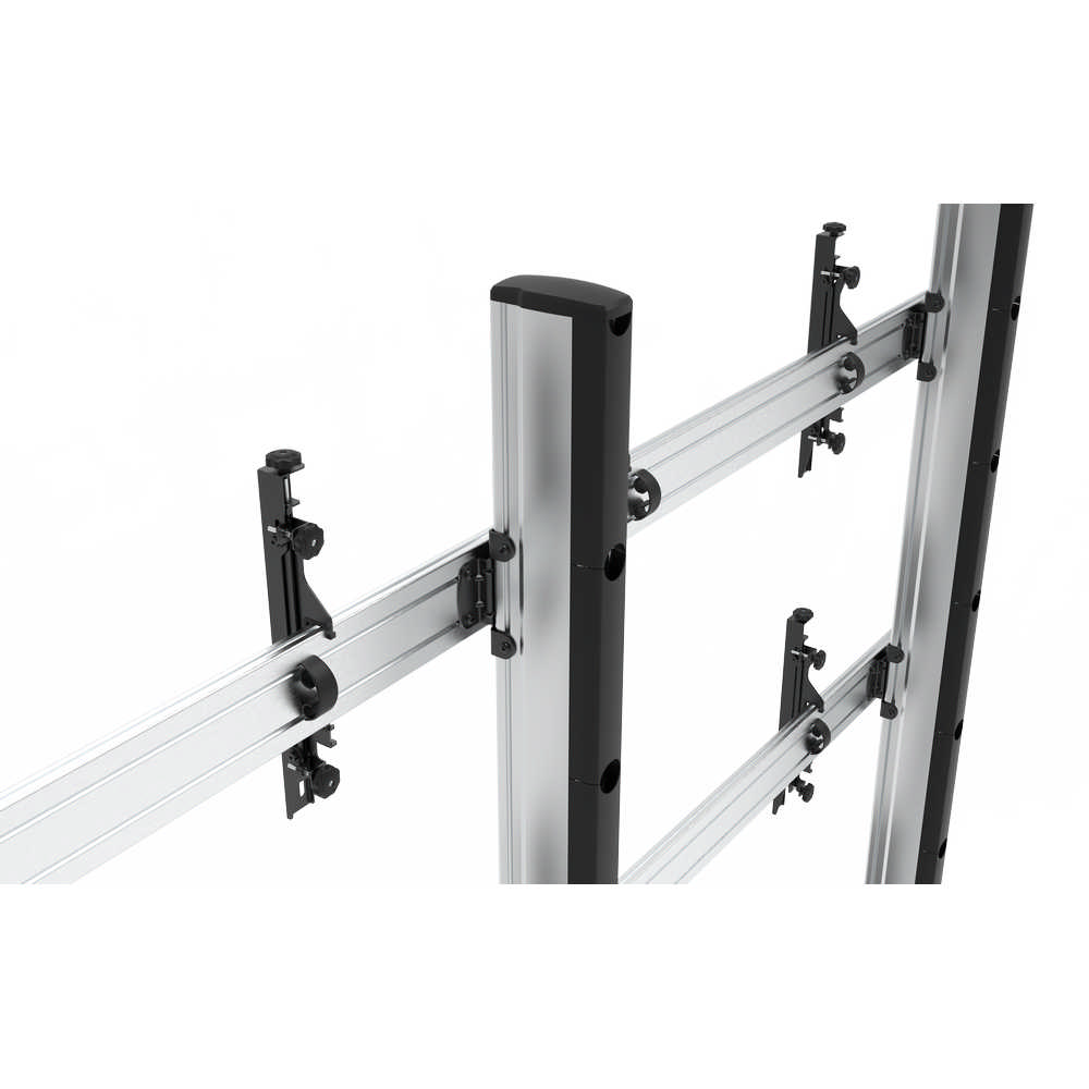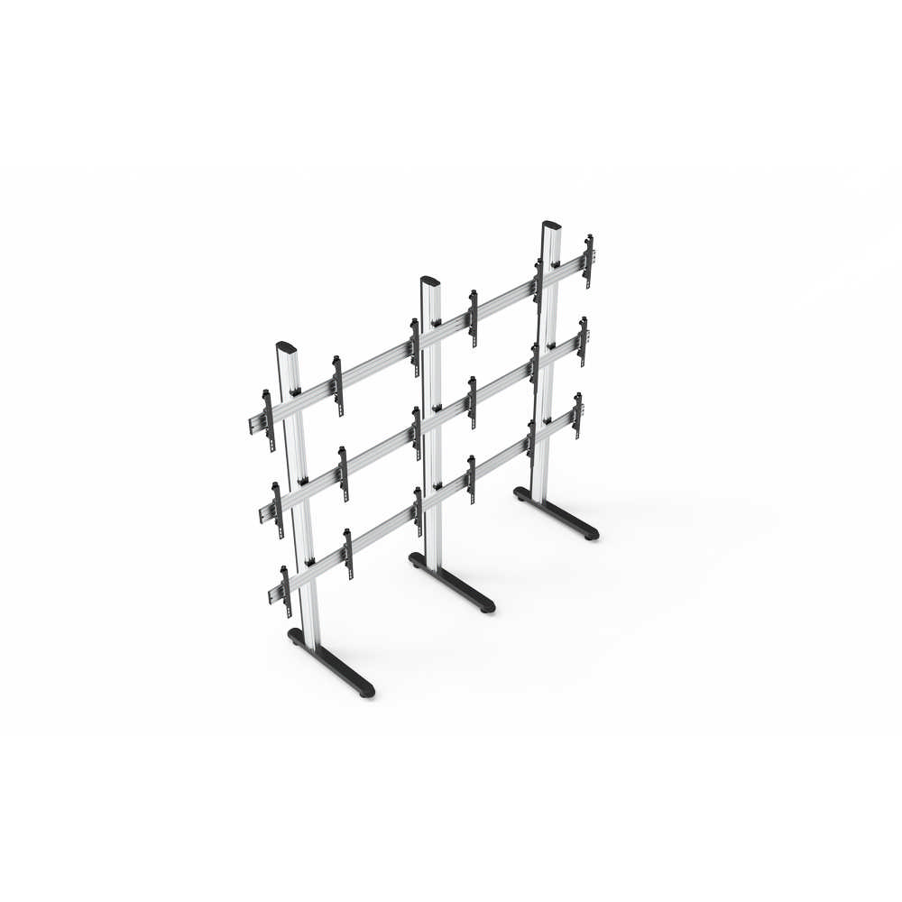 As Peças&Componentes para a Série Modular juntaram-se para formar o Suporte de Chão Autoportante/Carrinho para Videowall 3x3 Napofix® Example_17, uma das infinitas configurações possíveis dentro das Soluções Modulares. Composto principalmente por alumínio e aço com acabamento epoxi negro, este suporte para videowall 3x3 foi projetado para acomodar a maioria dos ecrãs de 55-60'' até 50kg e VESA até 600:400. O micro-ajuste permite o alinhamento perfeito dos ecrãs. Com o opcional Napofix® VW131, este suporte autoportante transforma-se num suporte de carrinho, facilitando a movimentação de um lugar para outro. A gestão de cabos integrada garante uma aparência limpa e organizada.