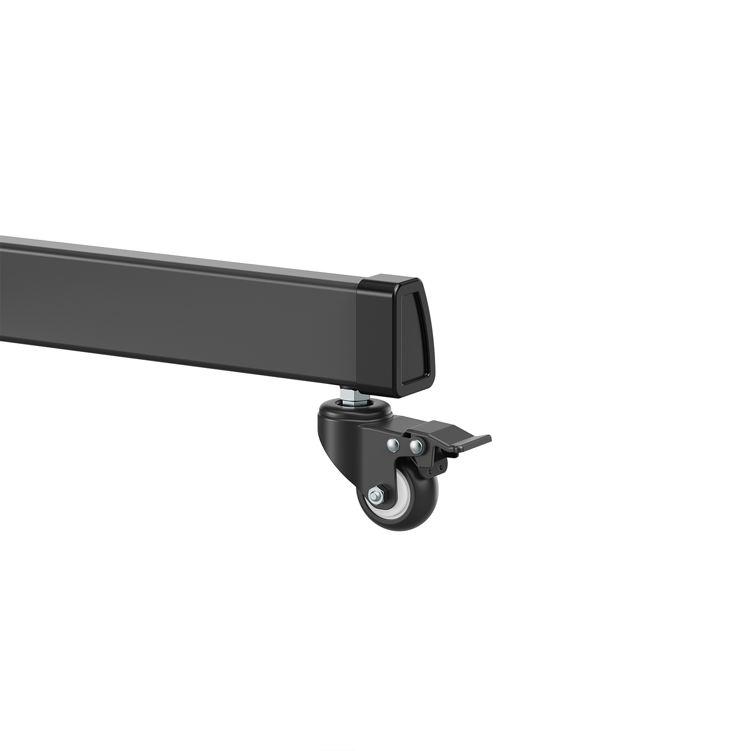 Apesar da sua dimensão imponente, a mobilidade continua a ser uma prioridade. Os quatro rodízios de alta resistência, todos com travão, permitem mover o conjunto de forma controlada e segura. O sistema de gestão de cabos integrado complementa o seu design profissional, assegurando uma apresentação limpa, organizada e livre de fios.