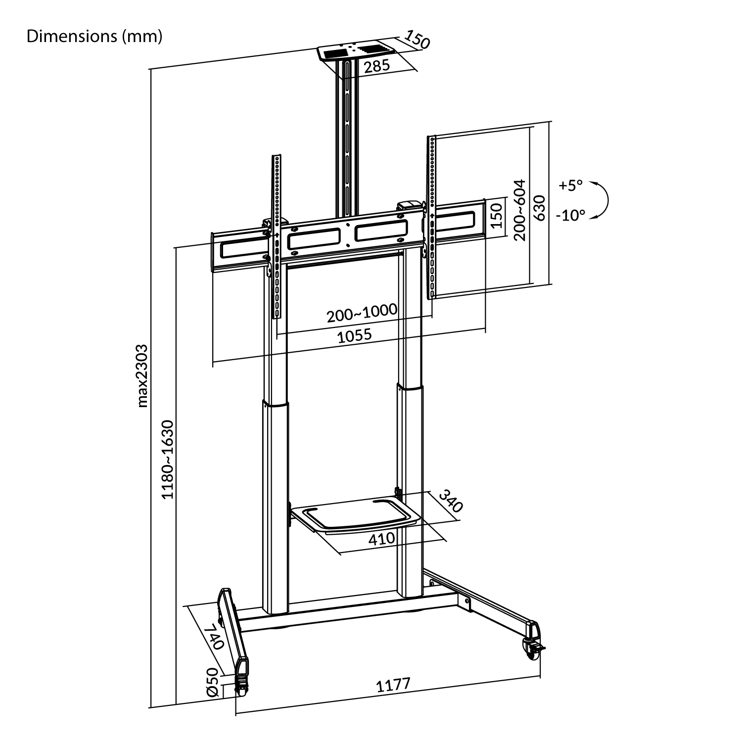 Construído para impressionar, o Suporte de Chão Carrinho AA para TV Napofix® VWA1230B-A acomoda ecrãs de 60 a 100 polegadas, com uma extraordinária capacidade de carga de 120 kg. A sua estrutura ultra-reforçada em aço e a compatibilidade VESA expansiva, até um máximo de 1000x600, oferecem uma segurança e estabilidade máxima. Permite um ajuste de altura de 1180 a 1630mm, e uma inclinação precisa de +5° a -10°, assegurando que o conteúdo é sempre exibido no ângulo de visão ideal para qualquer audiência.